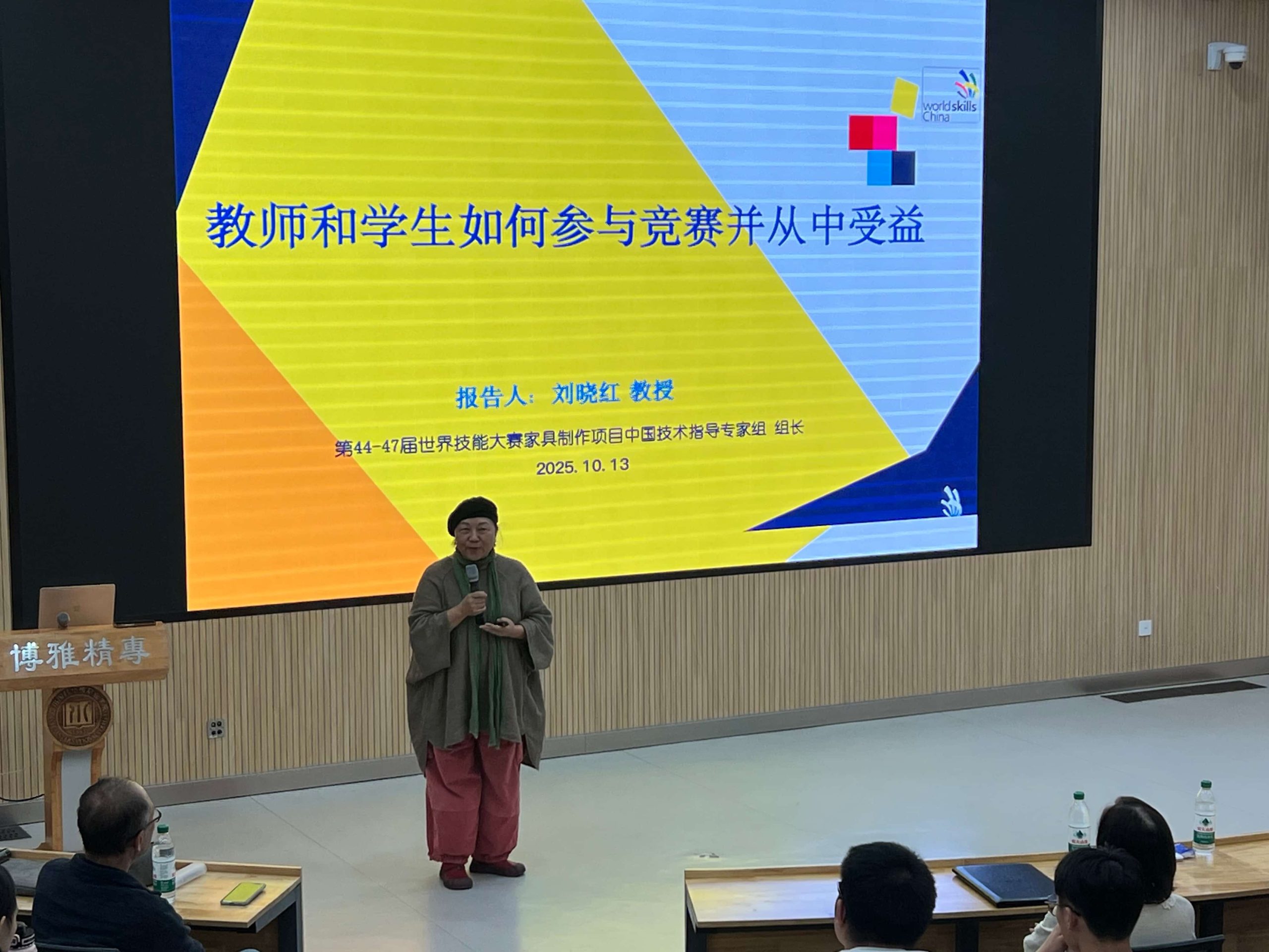 下半场主题转向高水平竞赛,来自世赛家具制作项目的中国首席专家刘晓红以“教师和学生如何参与竞赛并从中受益”为主题展开了精彩讲解。刘教授结合自身丰富的裁判或指导经验,从中国参加世赛的历程展开,展示了中国青年在世赛取得的巨大成就,深入剖析了世界技能大赛的竞赛标准、技术规范及选手选拔与培养机制。她指出,参与高水平竞赛不仅是技能的比拼,更是对选手心理素质、时间管理能力和创新思维的全方位锤炼。刘教授以多个世赛获奖选手的成长经历为范本,精彩展示了如何以竞赛激发学生的内在动力。她提到,在“以赛促学”的实践中,学生不仅被动接受知识,更主动投身于真实项目,其批判性思维、创新意识、工匠精神及应变能力等得以同步锤炼。这一过程让学生从“被动学习”转向“主动探索”,从而清晰锚定职业方向,实现个人能力的阶梯式跃升。