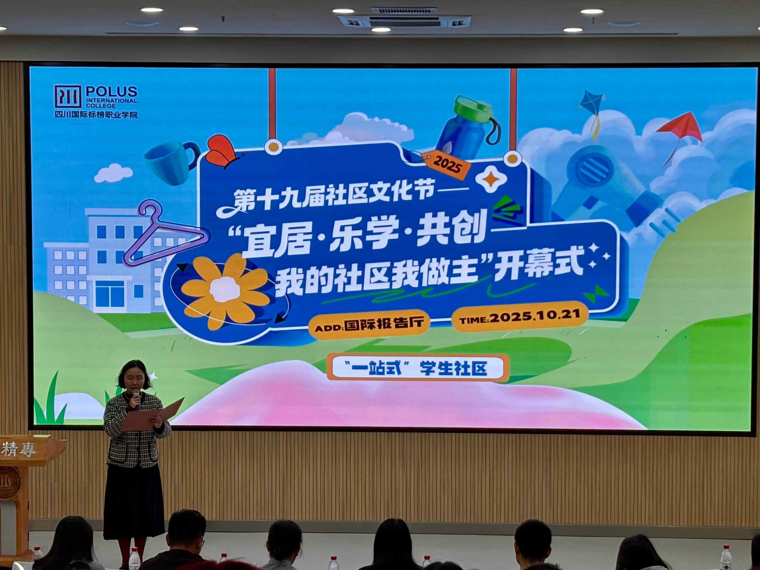2025年10月21日下午,四川国际标榜职业学院第十九届社区文化节开幕式在国际报告厅顺利举行。本届文化节以“宜居·乐学·共创——我的社区我做主”为主题,旨在通过系列文化活动深化“一站式”学生社区建设,营造积极向上的育人环境。学生工作部部长罗欢,校团委书记杨小平,各二级学院党总支书记等出席,百余名师生代表共同见证这一重要时刻。