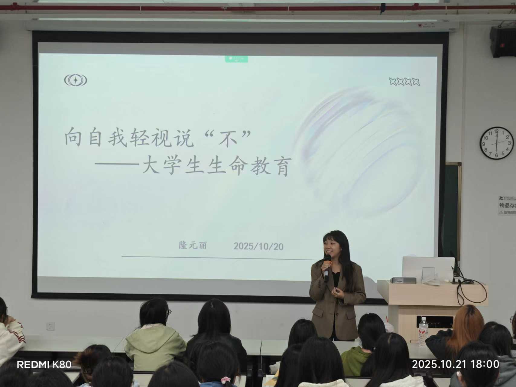 为引导学生珍视生命、探寻价值,以积极心态开启大学生活,我校于2025年10月21日晚,由心理健康中心隆元丽在12-102室组织开展以“向自我轻视说‘不’”为主题的生命教育讲座。本次讲座吸引了近150名学生踊跃参与,现场座无虚席。
