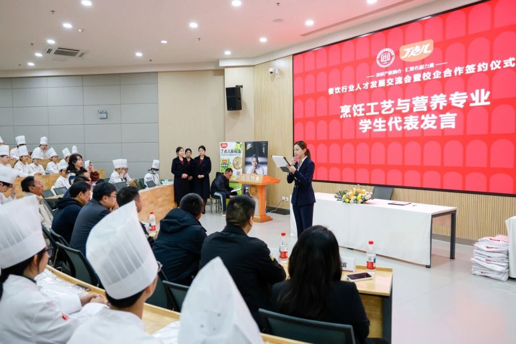 仪式在热烈而庄重的氛围中拉开帷幕,刘一沛院长在致辞中指出,产教融合作为职业教育高质量发展的核心驱动力,是培养适应新时代产业需求高素质技能人才的关键路径。学院将以此次合作为契机,全方位、深层次拓展校企合作的广度与深度,通过精准对接行业需求,优化人才培养方案,为餐饮产业源源不断地输送兼具扎实理论知识与卓越实践能力的复合型人才。