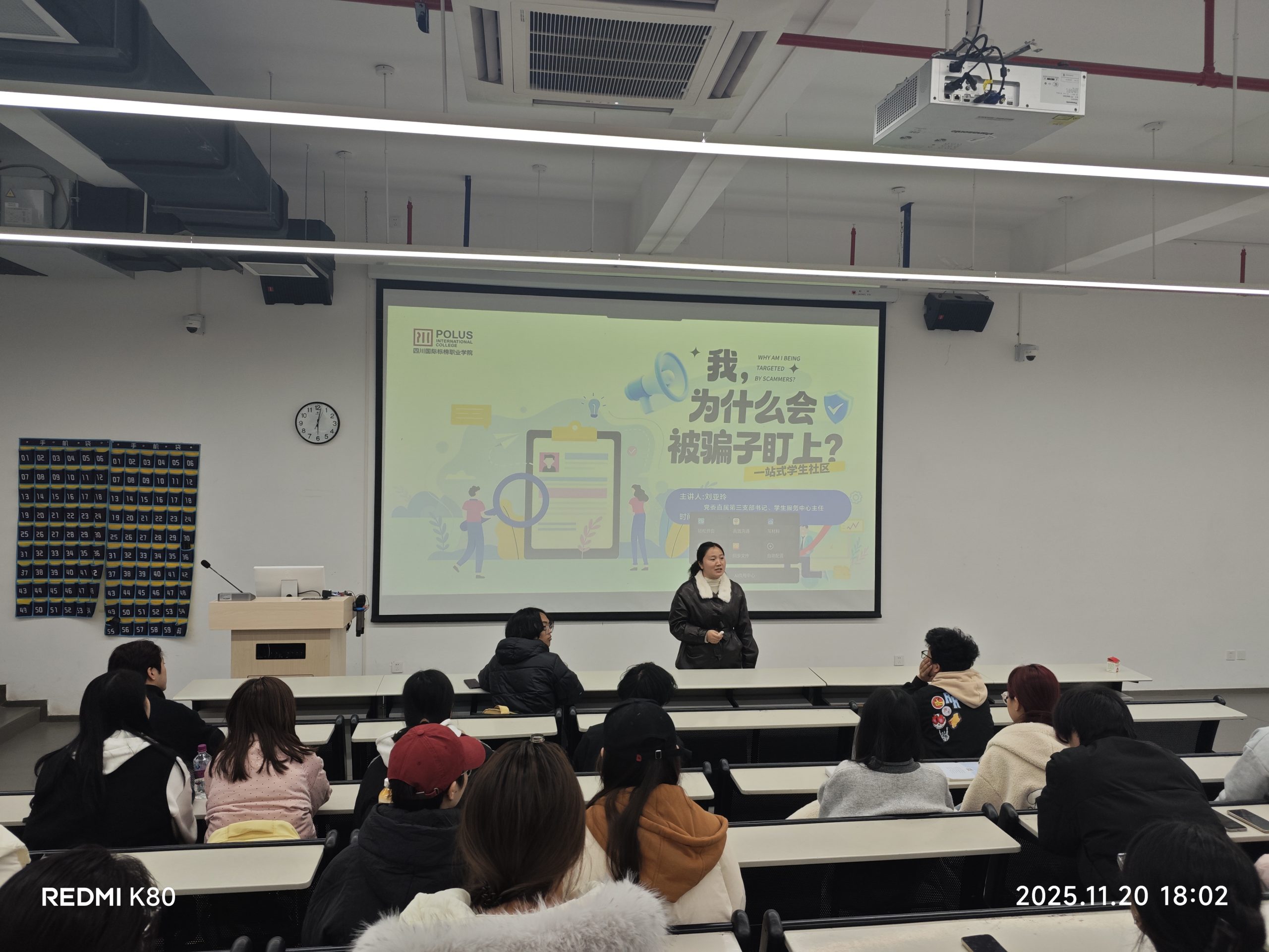 为进一步增强学生防范电信网络诈骗的意识和能力,营造安全、稳定、和谐的校园环境,2025年11月20日晚,“我为什么会被骗子盯上”的主题讲座在12-101教室顺利举行。本次讲座是我校第十九届社区文化节的重要组成部分,由党委直属第三支部书记、学生服务中心主任刘亚玲主讲,吸引了众多学生积极参与。