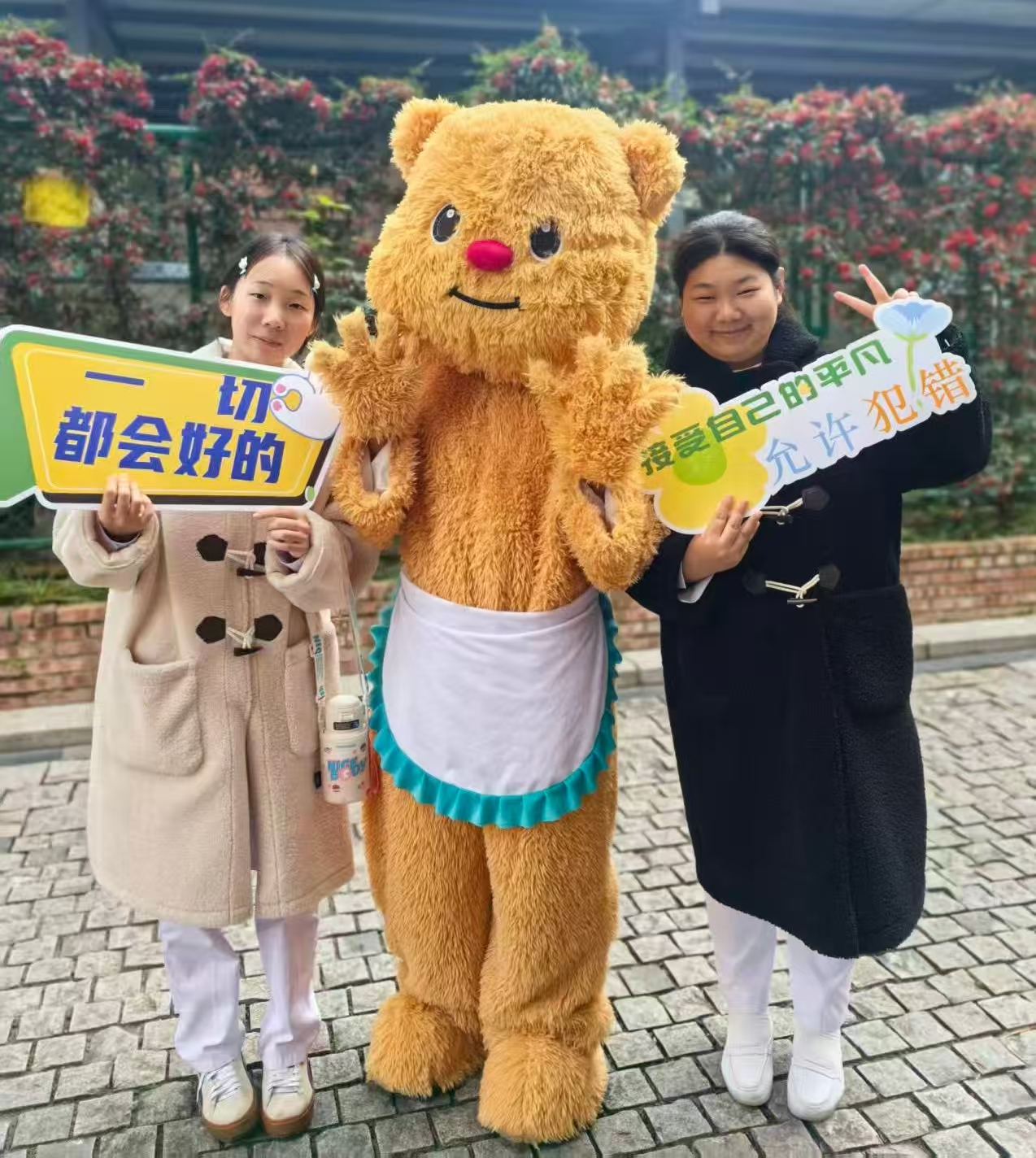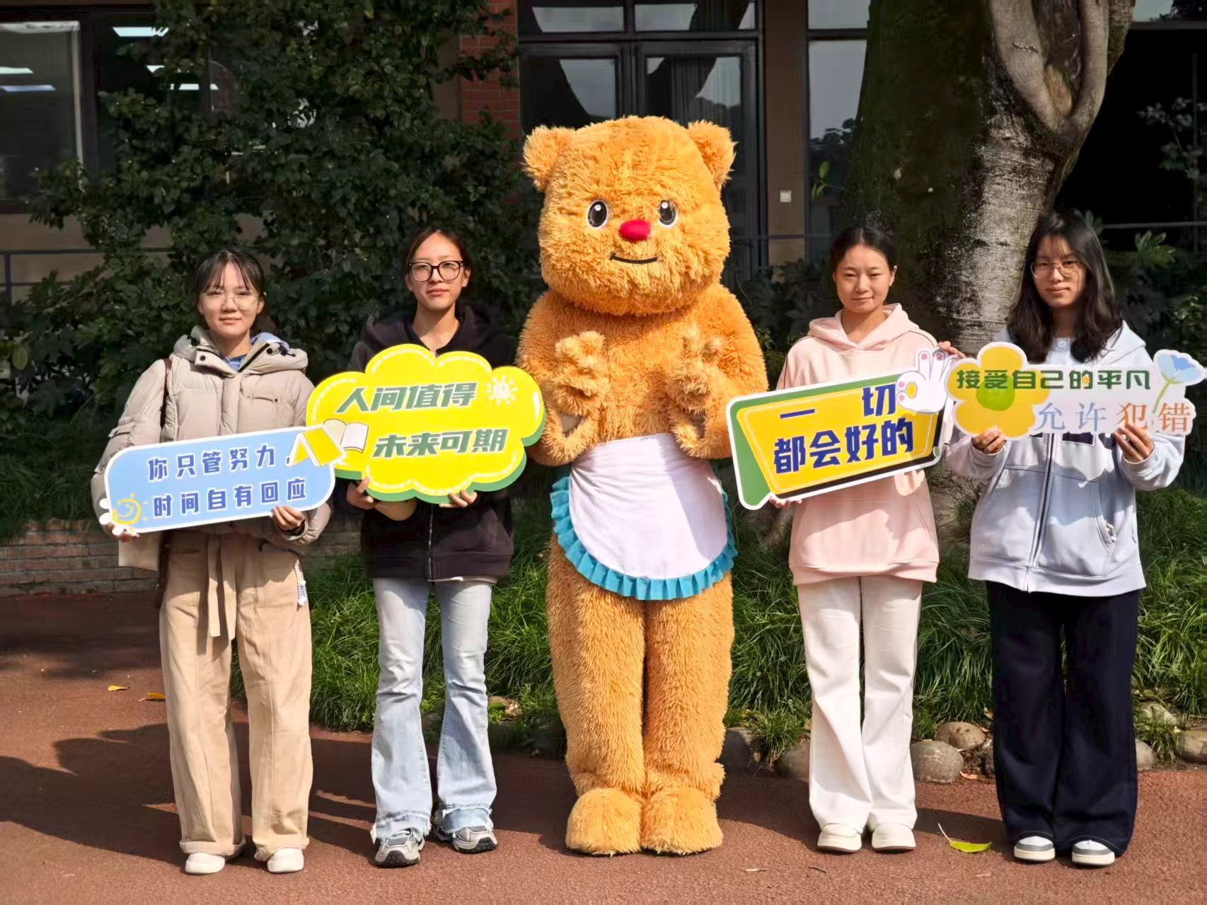 活动现场气氛热烈,同学们纷纷与柔软治愈的黄油小熊拥抱、合影,并手持与自己心境契合的标语牌。“感觉压力大的时候,看到这句话和小熊,心情真的放松了不少,”一位同学分享道,“这是在提醒我们,爱别人之前,首先要学会爱自己。”