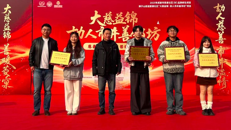 在2025年度狮子山街道菱窠社区“大慈益锦·劼人市井善邻坊”慈善项目总结表彰中,艺术与设计学院青年志愿者团队凭借在义剪志愿服务活动中出色且持续的奉献,被授予“优秀志愿者团队”荣誉称号。这一沉甸甸的荣誉,是对标榜青年学子社会责任感和专业实践能力的高度认可!
