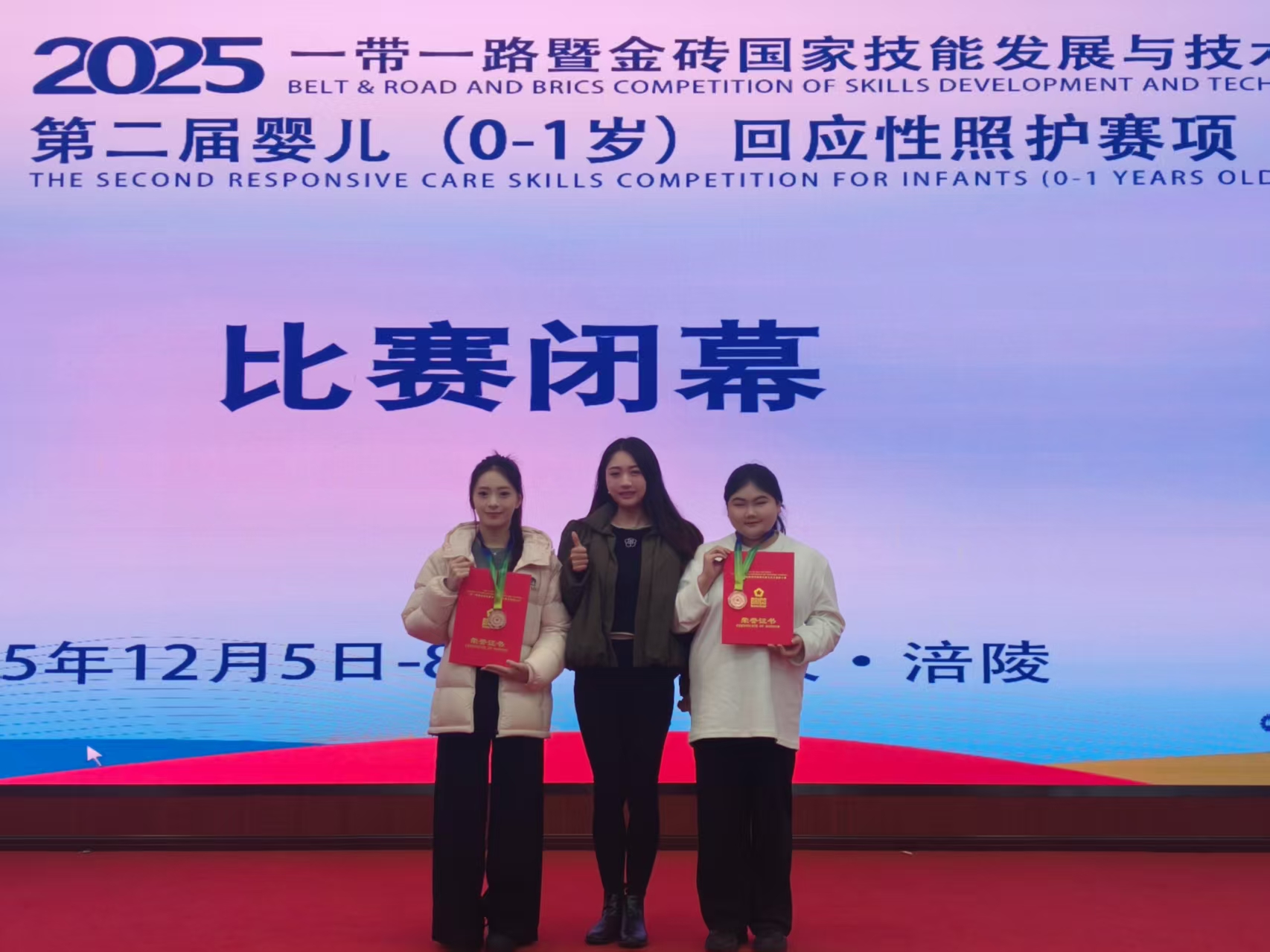 为积极响应国家“一带一路”倡议,深化产教融合,2025年12月6日至8日,我校选派师生参加了“2025一带一路暨金砖国家技能发展与技术创新大赛——第二届婴儿(0-1岁)回应性照护赛项”。由医药健康学院护理系王昭怡老师指导,李佳鹂和陈师畅两位同学组成的代表队表现出色,最终荣获两项国家级三等奖。