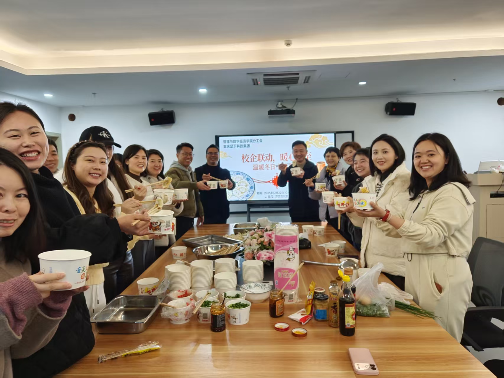 时值冬至佳节,为增强学院教职工凝聚力,营造浓厚传统节日氛围,搭建校企联动平台,凝聚双方育人合力,提升教职工获得感与幸福感,管理与数字经济学院分工会与重庆足下科技集团携手举办 “校企联动,暖心冬至” 主题活动。