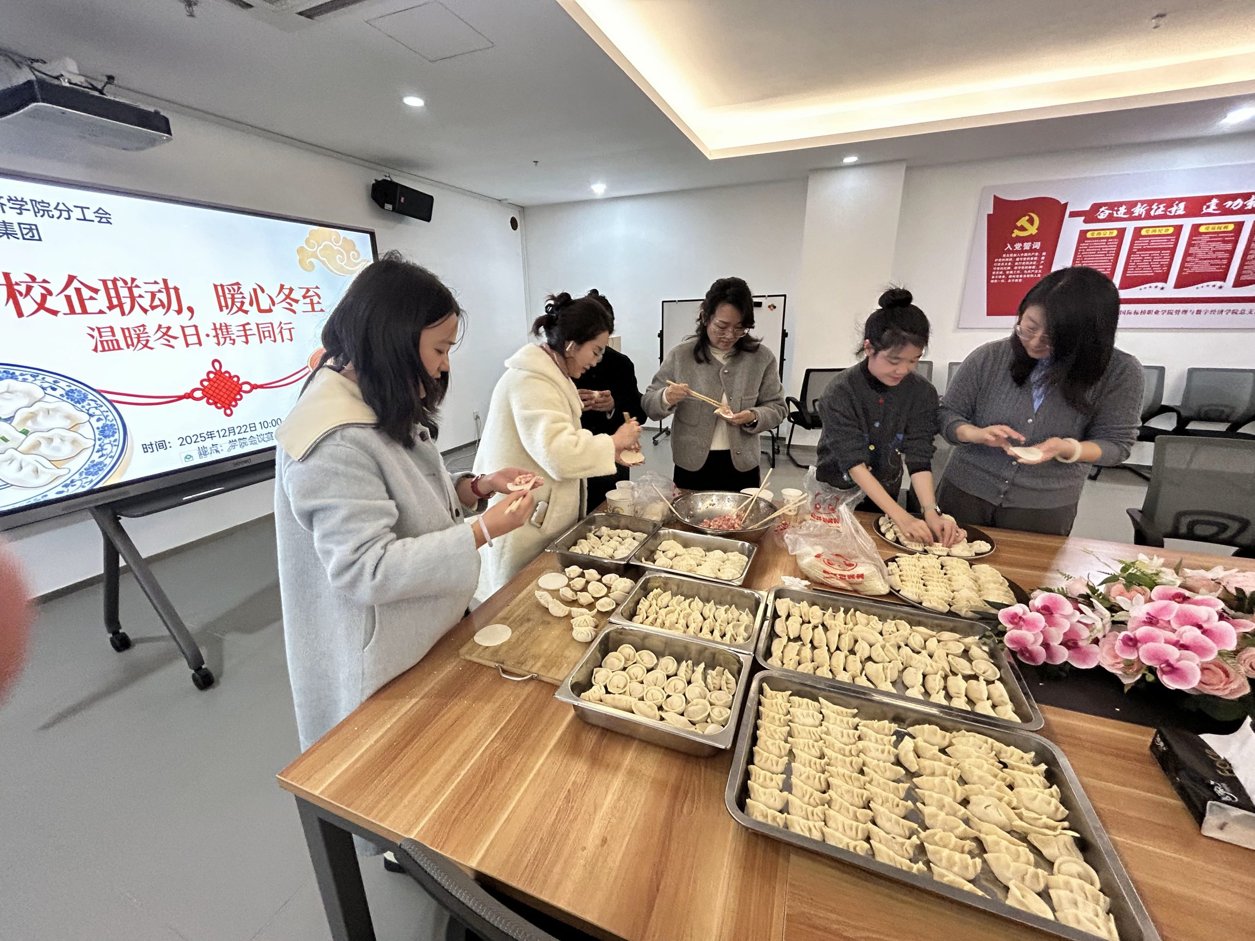 活动特别邀请学校党委副书记、学工副院长孙启平,分管教学副院长庄红,学校副院长、工会主席杨乐出席。活动诚邀管理与数字经济学院全体教职工及重庆足下科技集团标榜校区全体教职工欢聚一堂,共庆佳节。活动于 12 月 22 日10:00—14:00 在学院会议室开展,活动内容包括包饺子、品羊肉汤特色环节,让老师们在动手实践与美食共享中感受冬至暖意与团队温情。
