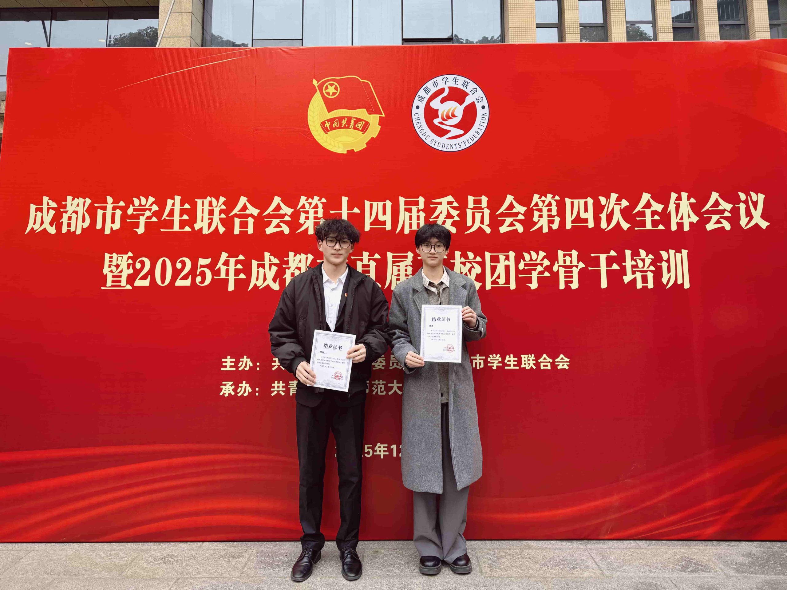 为进一步加强团学骨干队伍建设,切实提升其思想政治素质与业务能力水平,根据《2025年度全市团干部教育培训工作方案》部署,共青团成都市委学校部于12月26日在四川师范大学组织举办了2025年成都市直属高校团学骨干培训班(第二期)。我校团委学生副书记夏晨、校学生会执行主席范炜作为代表参加本期培训。