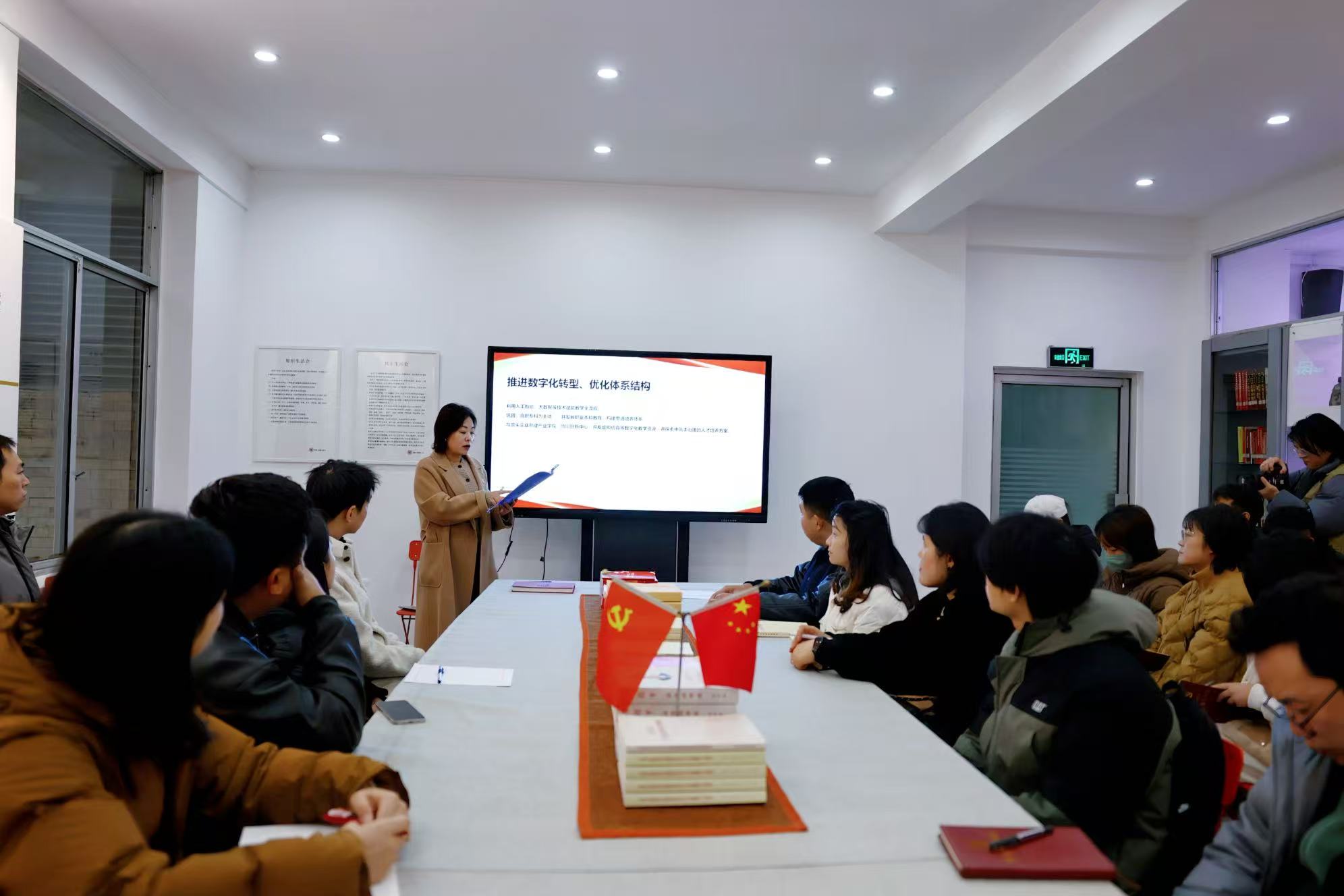 为深入学习贯彻党的二十届四中全会精神,准确把握新时代职业教育发展的战略方向,近日,艺术与设计学院教师党支部在党群工团活动中心召开党员大会,专题学习党的二十届四中全会关于职业教育的指导思想。会议由党支部书记邓律同志主持并领学,支部党员参加学习。