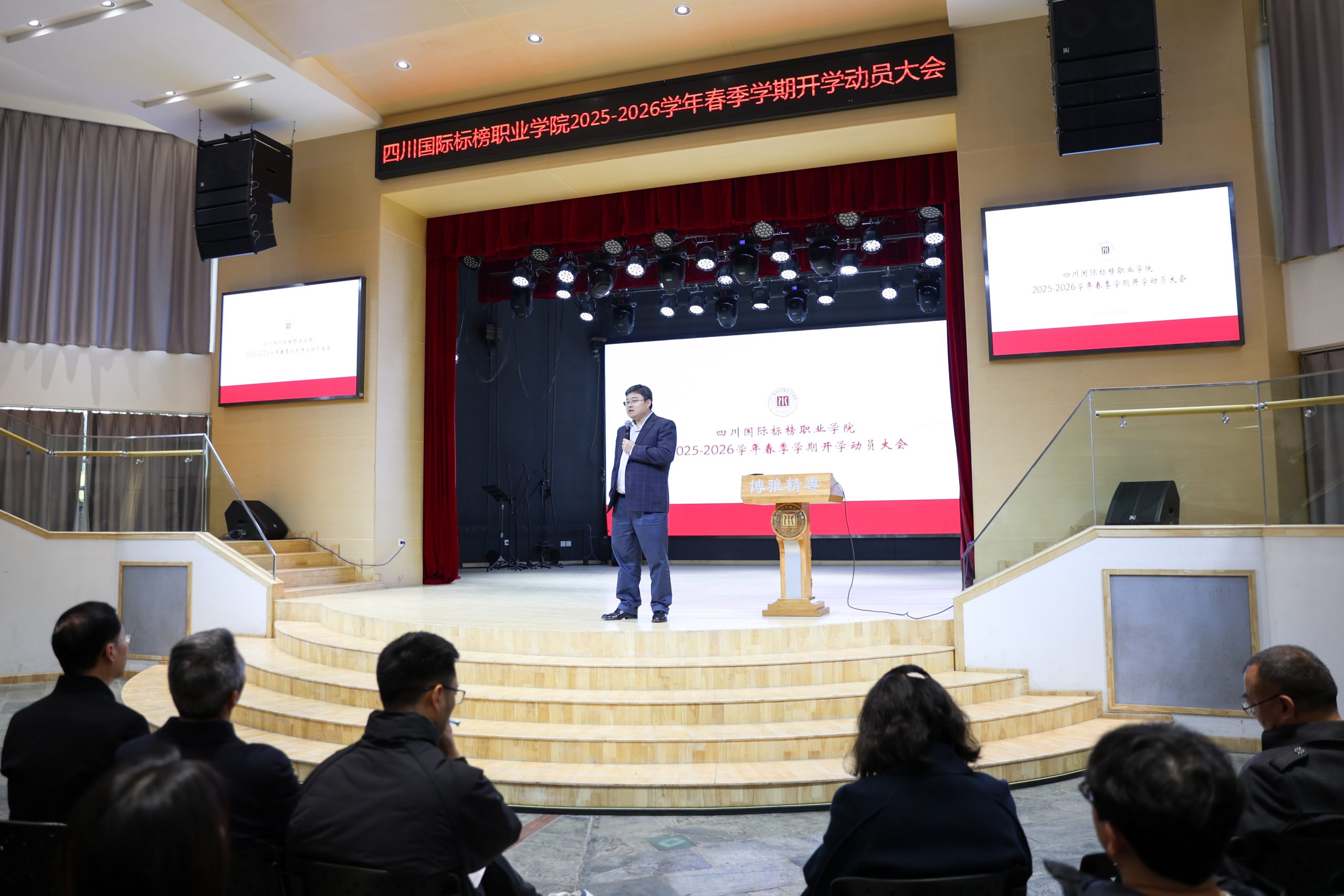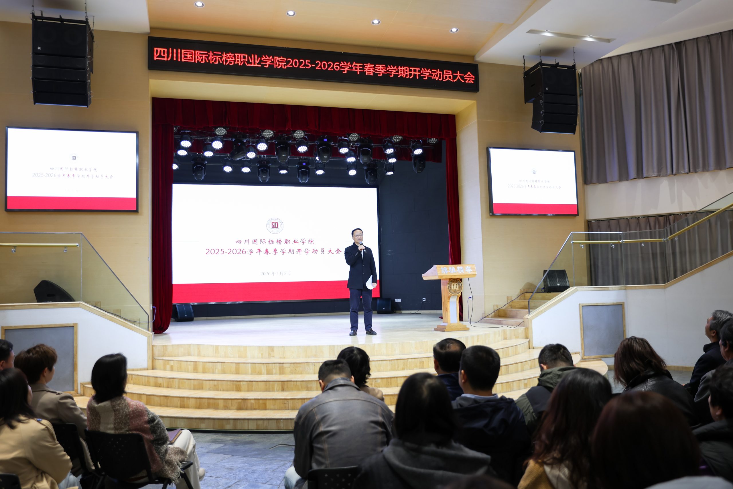 春回大地,万象更新。3月5日,学校在小剧场召开2026年春季学期开学动员会。会议既是统一思想、调整状态的“收心会”,也是明确目标、激发干劲的“誓师会”,为新学期学校各项工作开好局、起好步奠定坚实基础。会议由党委副书记孙启平主持,党委书记曾诚和院长刘一沛分别发表讲话,为新学期的工作指明方向,提振士气。