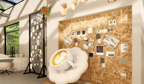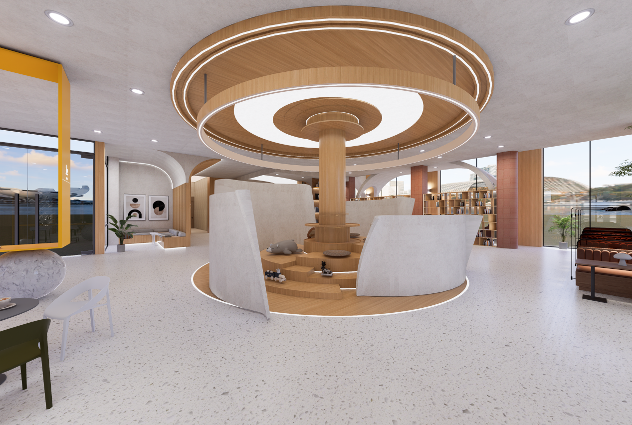 而同专业的李梓瑜则构建了一个公共商业空间模型《爪爪咖啡》。“我想打造一个真正能让人和宠物都放松、互动的新型城市客厅。”她采用“外动内静”的布局:户外庭院成为宠物奔跑社交的生态乐园;室内则通过通透的观景窗、科学的人宠分流以及全屋智能新风系统,确保人类顾客能舒适休憩、安心互动。“核心是通过设计消弭隔阂,让共处自然而愉悦。”
