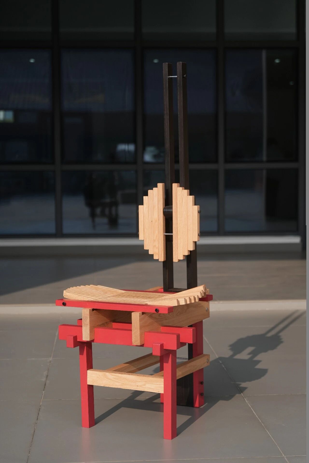 “我想把‘中国建筑的灵魂’装进日常里。”家具设计专业郭艺晗的毕业设计《红章》系列家具,以中国古建筑斗拱的榫卯结构为灵感源头。她拆解了斗拱“榫卯相契、层层承重”的力学与智慧美学,把它转译为一椅一几的当代形态。腿架以“齐心斗”为原型做渐变收分,完全依靠榫卯咬合实现无钉承重。材料选用红橡木与白椿,饰面采用传统的木蜡油与半封闭漆工艺,反复打磨出温润的哑光质感。