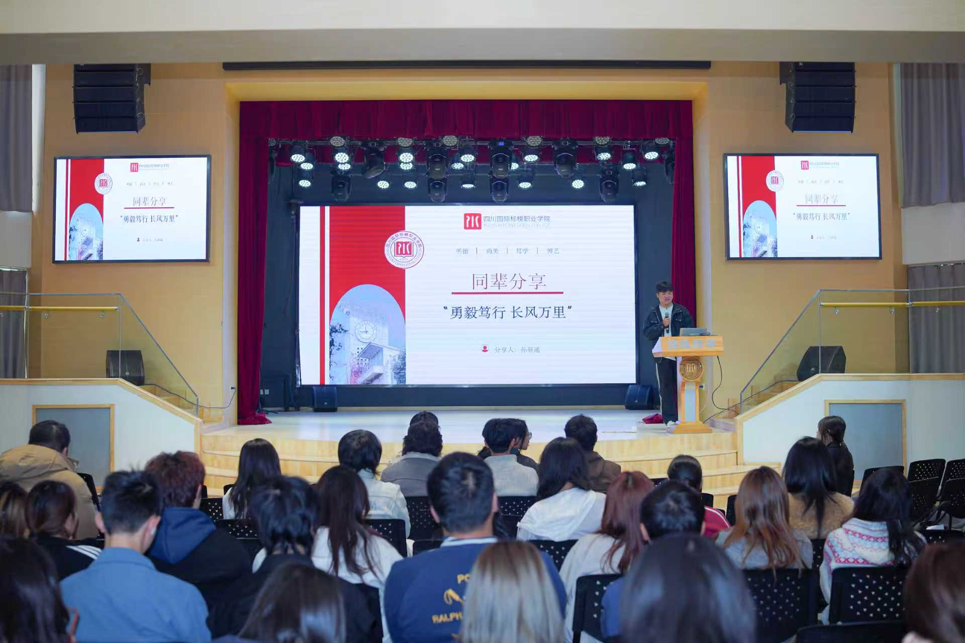 为充分发挥优秀学生的榜样引领作用,激励广大同学见贤思齐、奋发向上,2026年3月25日,艺术与设计学院在学校小剧场举办“朋辈榜样分享会”活动。本期分享会邀请到互联网游戏动漫开发专业23级优秀学生、中共预备党员孙硕通同学担任主讲人,他以“勇毅笃行,长风万里”为主题,向在场学弟们分享了他在专业学习、学生工作、志愿服务等方面的成长经历与心路历程。