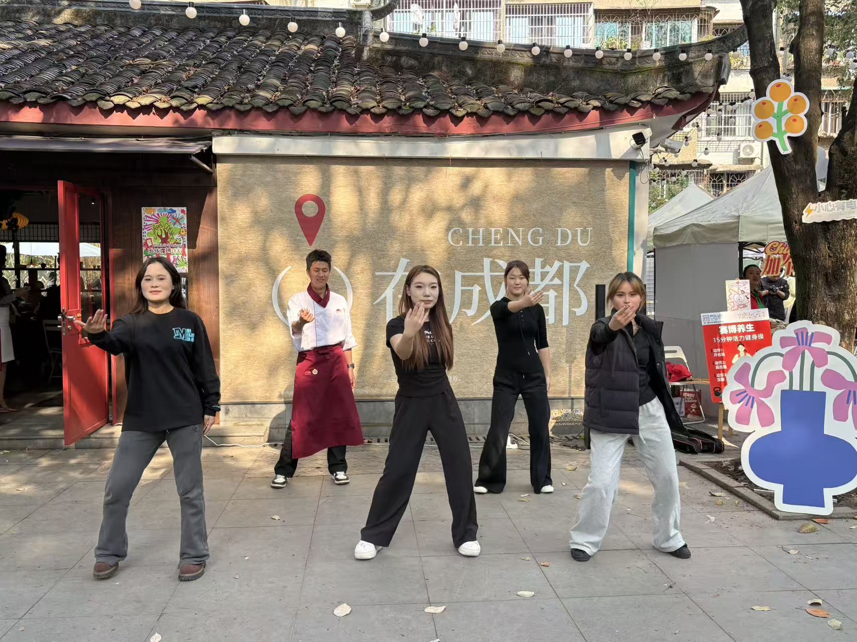 整点时分,体育与旅游学院专业学生现场引领活力满满的健身操快闪,带动在场居民一起活动筋骨,欢声笑语中传递健康理念。