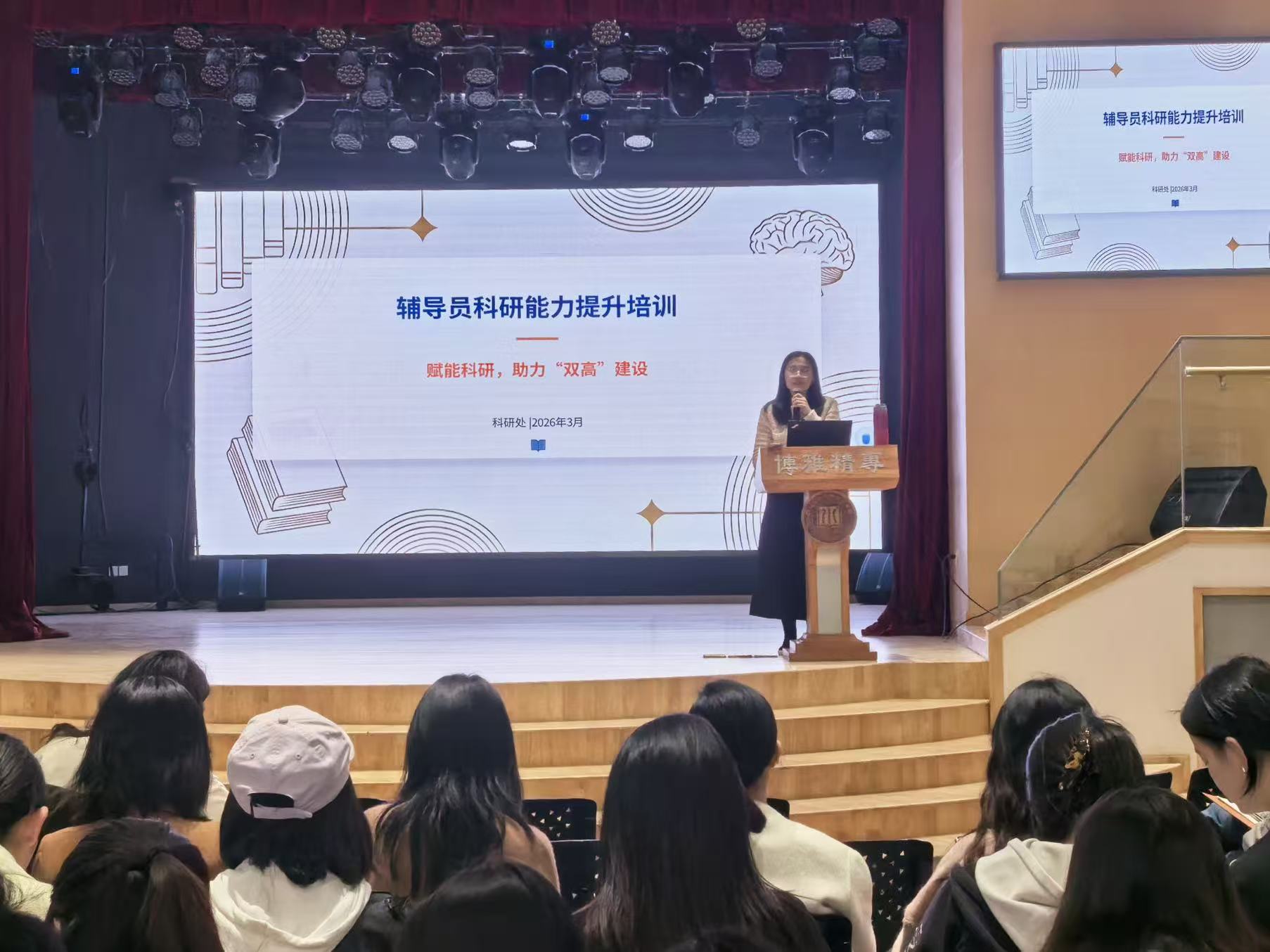 为深入贯彻落实立德树人根本任务,进一步提升辅导员队伍科研思维与科研能力,推动辅导员队伍专业化、职业化发展,我校学工部联合科研处于2026年3月31日在小剧场成功举办了“辅导员科研能力提升”培训,本次培训由科研处处长刘洁担任主讲,辅导员发展中心主任张元、各学院学工办主任及全体辅导员参加。