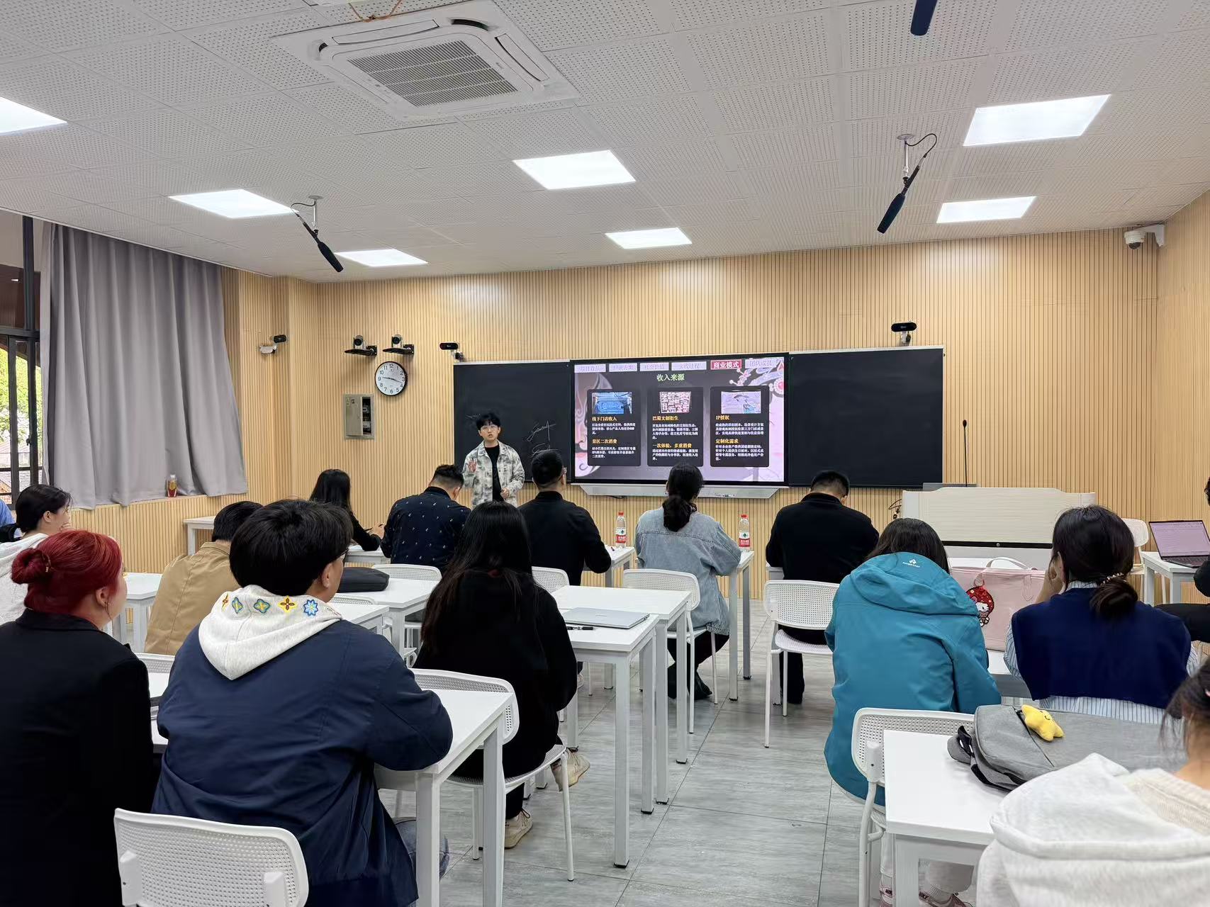 比赛现场秩序井然、氛围热烈,各参赛团队依次登台答辩,围绕项目背景、创新点、实施方案及实践价值等内容进行详细阐述,条理清晰、重点突出。参赛作品紧密结合乡村振兴、文化传承、社会服务等时代主题,深度融合人文与教育学院专业特色,将理论知识与实践应用有机结合,展现出我院学子扎实的专业素养、较强的协作能力和鲜明的创新意识。