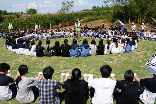 下午的团建将整场研学推向高潮。在“动力绳”环节中,全体学生手握同一根绳索,围成同心圆,将绳齐胸拉紧。随着指令,绳索在学生手中化为一圈充满张力的闭环。陈校长身先士卒缓缓踏上绳圈,在同学们的合力支撑与搀扶下,稳步行走于绳索之上。绳下是坚实的人墙,绳上是信任的传递。全程无声的默契与紧绷的绳索,比任何说教都更直观地诠释了“拧得成绳”的含义。