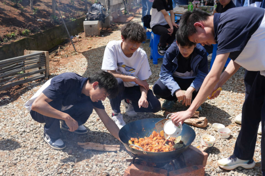 真正的挑战出现在中午。各小组需自行搭灶生火、洗切烹饪,完成一顿午餐。从捡拾柴火到控制火候,从食材分配到分工协作,不少小组经历了火灭烟熏、调味失手的小插曲。但正是这些不完美,让最终端出的每一道菜都格外珍贵。一位高一学生坦言:“以前觉得做饭是件小事,今天才知道让火不灭、让饭不焦,每一步都是学问。”
