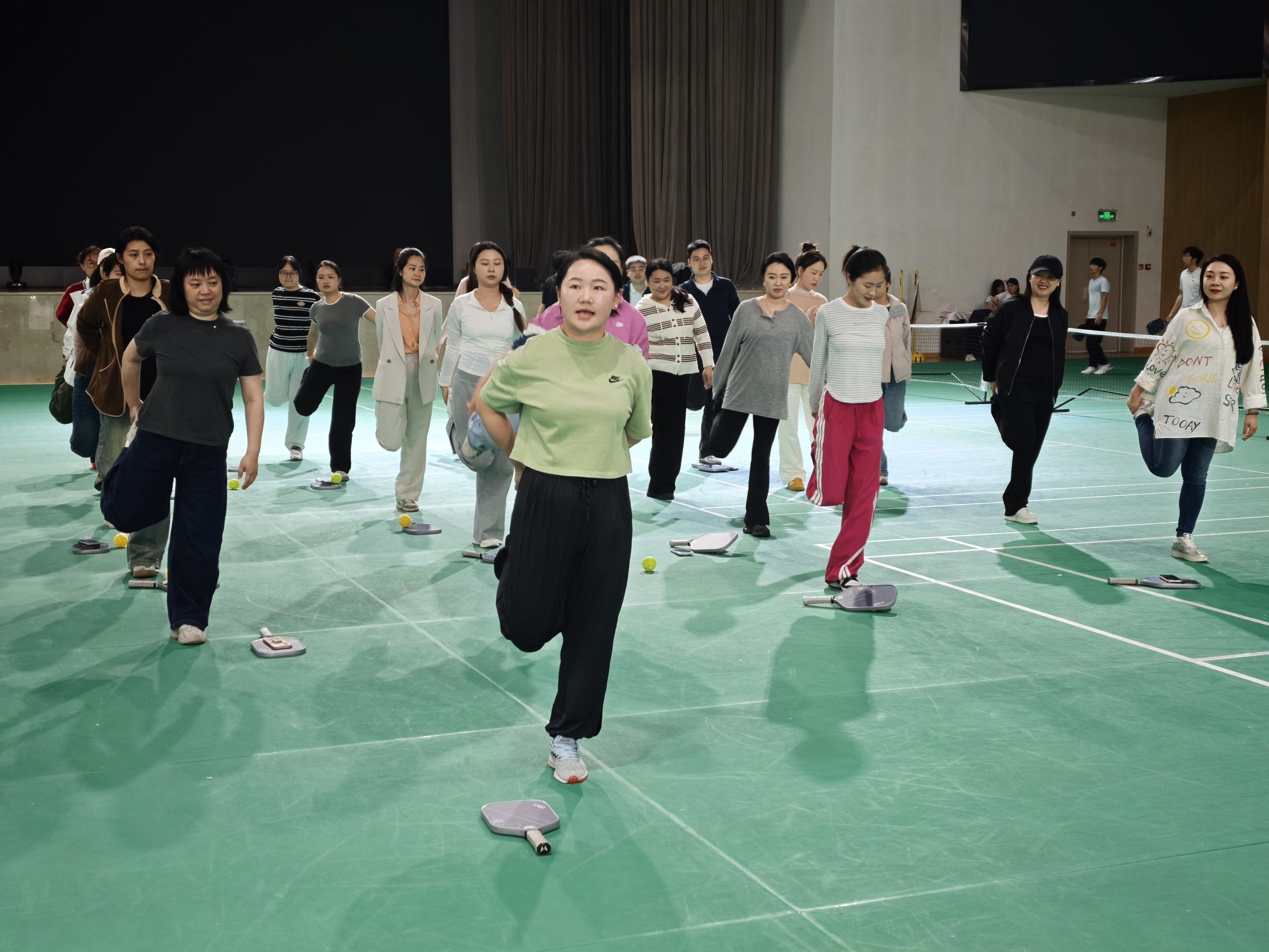 活动伊始,一级网球裁判、一级社会体育指导员周美玲老师及体育与旅游学院专任教师吴老师围绕匹克球的起源、场地规则与安全注意事项展开细致讲解,帮助零基础参与者快速建立运动认知。在完成热身运动后,教练团队通过分组教学形式,现场示范握拍、发球、接球、移动步伐等基础动作,并针对个体差异进行一对一指导。辅导员们从生疏尝试到熟练配合,逐步掌握运动技巧,现场互动频繁、学习氛围浓厚。