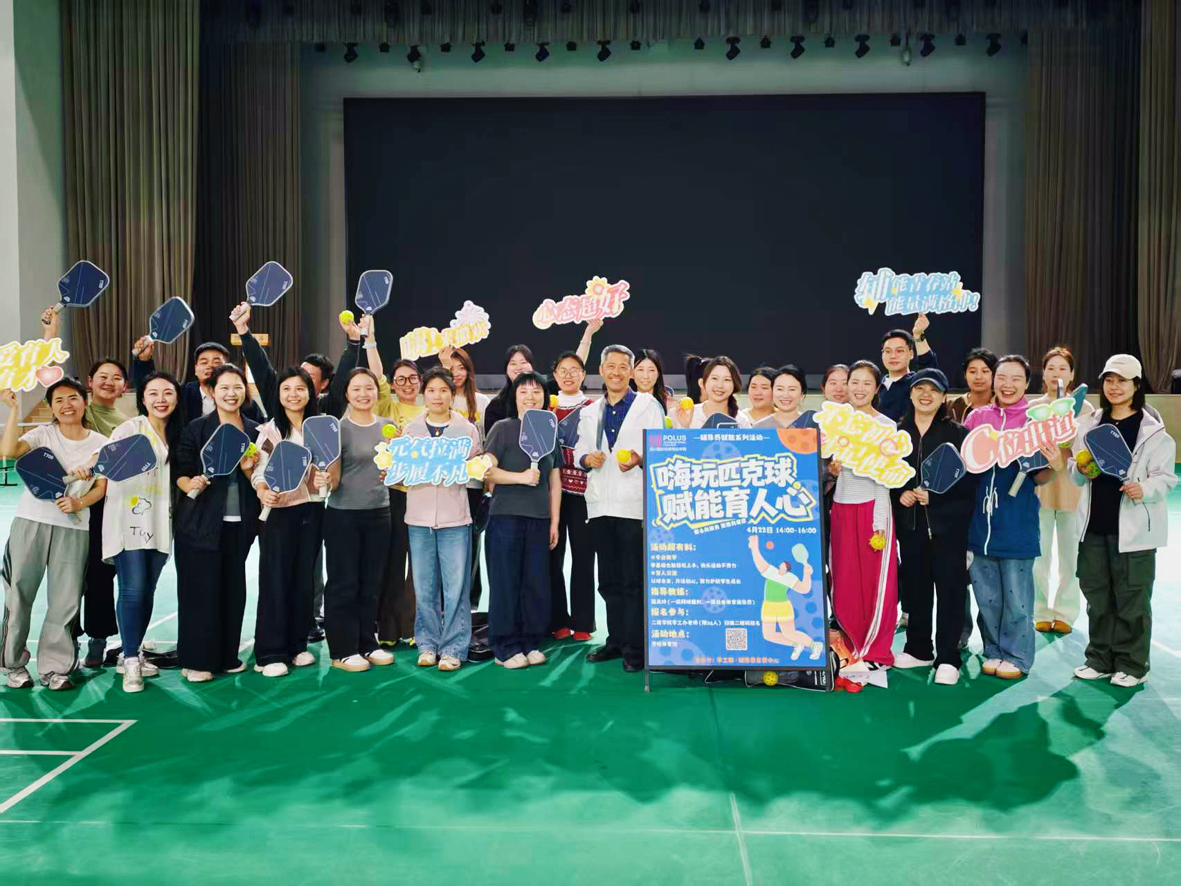 为积极响应新时代高校辅导员队伍建设号召,切实提升辅导员身心健康水平与团队协作效能,2026年4月22日下午,由学生工作部辅导员发展中心主办的“运动赋能成长,聚力护航育人”辅导员匹克球运动赋能活动在学校体育馆成功举办。学校党委副书记、纪委书记、学工副院长孙启平,党委委员、学生工作部部长罗欢出席活动,与来自各二级学院的30余名学工办老师共同参与,在活力四射的运动场上展现育人工作者的别样风采。
