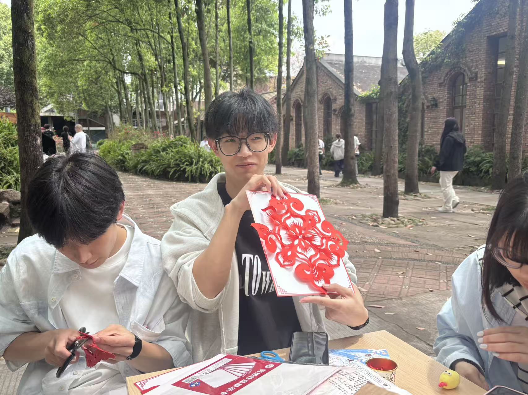 在民族手工活动环节,同学们沉浸式体验了各具特色的民族传统手工艺制作。活动选取了剪纸、编织、民族服饰贴画等具有代表性的项目,参与同学一边动手实践,一边了解每项技艺背后的历史渊源与民族故事。精美的手工作品,既展现了青年学生的创意与巧思,也凝聚着“中华民族一家亲”的真挚情感。