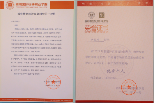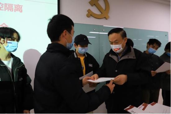 下午16:00,学院党委书记任再生、党委副书记孙启平、学工部部长罗欢,以及二级学院党支部书记、学工办主任们一起为解除隔离的学生送上“致疫情期间被隔离同学的一封信”,并为其颁发新冠疫情防控隔离“优秀个人”证书。